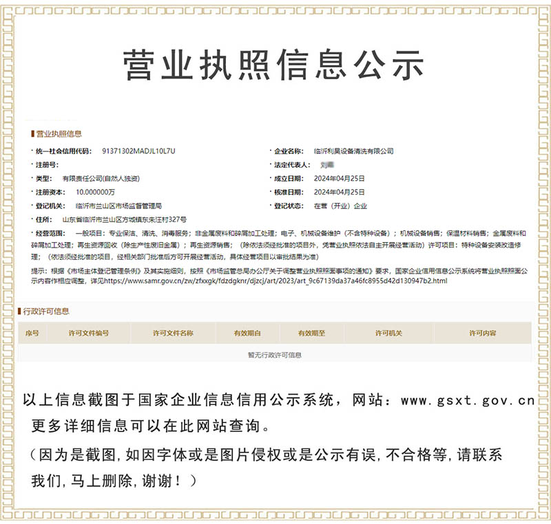 憑借著可靠的品質(zhì)、服務(wù)和良好的信譽(yù),臨沂利昊設(shè)備清洗有限公司贏(yíng)得了眾多客戶(hù)的信賴(lài)與支持。我們始終秉持著精益求精的精神,不斷提升自身實(shí)力,為推動(dòng)行業(yè)發(fā)展貢獻(xiàn)力量,成為您可靠的合作伙伴。